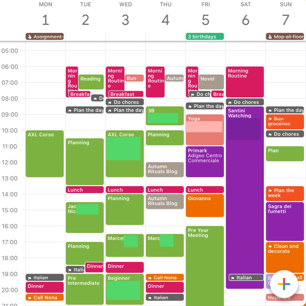 Landino asks us to schedule everything in blocks, including breakfast, showers etc and I did for a while but it drive me absolutely crazy and now I just schedule most things like cooking, cleaning and class prep etc once a week and limit myself to 10 mins per day to rejig my schedule if needs be. I love using Google Calendar for its simplicity, ease of moving things around and ease of adding different calendars plus its ability to be accessed on any device at anytime.